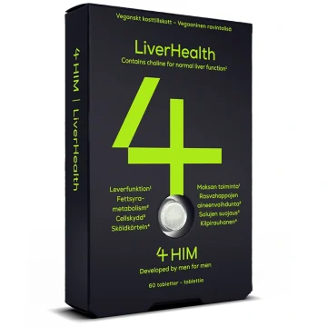 4HIM LiverHealth är ett kosttillskott för män som stödjer normal leverhälsa. Kosttillskottet innehåller 10 olika ingredienser av hög kvalitet i form av vitaminer, mineraler och växtextrakt. LiverHealth innehåller bland annat kolin, zink, E-vitamin, C-vitamin, selen och kronärtskocka. Kolin bidrar till att upprätthålla normal leverfunktion. Zink, E-vitamin och C-vitamin bidrar till att skydda cellerna mot oxidativ stress. Selen bidrar till normal sköldkörtelfunktion. 60 tabletter.