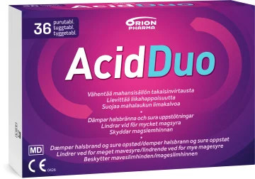 AcidDuo Tuggtablett används för att motverka sura uppstötningar och halsbränna. AcidDuo hjälper till att kontrollera för mycket syra i magsäcken och förhindrar halsbränna, magont och matsmältningsbesvär hos vuxna och barn över 6 år. Tabletterna har smak av ingefära, citron och mint.