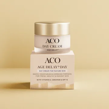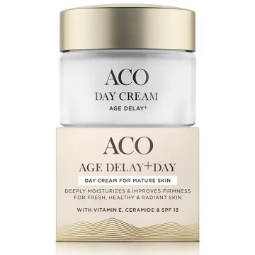 ACO Age Delay+ Day Cream SPF15 är en djupt återfuktande ansiktskräm med anti-age egenskaper. Dagkrämen är speciellt utvecklad för kvinnor efter klimakteriet. Den innehåller vårdande sheasmör och spänstgivande ceramid. Krämen innehåller även E-vitamin som skyddar huden mot fria radikaler, hyaluronsyra som återfuktar på djupet samt niacinamid som hjälper till att jämna ut hudtonen. Ansiktskrämen har SPF15 som skyddar mot UVA och UVB-strålning. Milt parfymerad. 50ml.
