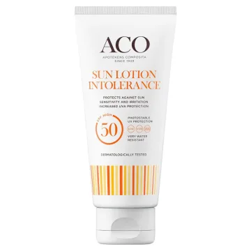 ACO Sun Lotion Intolerance Oparfymerad SPF50 är en solkräm speciellt anpassad för solkänslig hud. Med högt solskydd kombinerat med lugnande och återfuktande egenskaper. Innehåller ett utökat UVA-skydd och är lämplig för personer med solallergi eller soleksem. Passar känslig hud. Parfymfri. SPF50. 100 ml.