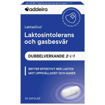 Addeira LaktasDuo är en dubbelverkande medicinteknisk produkt som förbättrar laktosnedbrytning och hjälper till att minska gasbildning och uppsvälldhet. Varje kapsel innehåller laktasenzym som hjälper kroppen att bryta ner laktos och smälta mjölksocker, samt dimetikon som minskar gasbildning och lindrar uppkördhet och svullen mage. Kombinationen ger effektiv lindring vid laktosintolerans och stödjer matsmältningen när du äter laktoshaltig mat. LaktasDuo är vegansk och fri från laktos, gluten, soja och gelatin. Kan användas av vuxna och barn från 6 år och kan tas i samband med laktosinnehållande måltider – antingen som hel kapsel eller genom att strö innehållet över kall mat eller dryck. 30 kapslar.