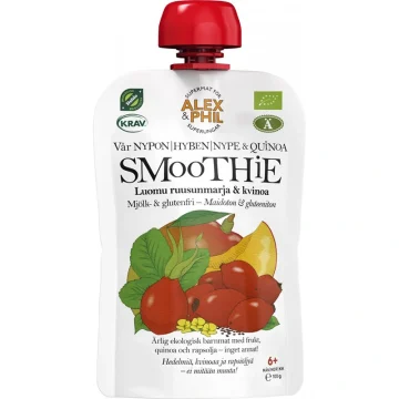 Alex & Phil Vår Nypon- & Quinoasmoothie är en mjölk- och glutenfri smoothie med smak av nypon och mango. Innehåller nypon som är rikt på järn och vitamin C. Med en bas av quinoa som ger en matigare konsistens. Innehåller även rapsolja som är rikt på Omega-3-fettsyror. Kommer i klämmis-format. Från 6 månader. Vegansk. 100 g.
