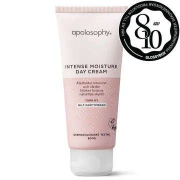 Apolosophy Intense Moisture Day Cream är en rik och djupverkande dagkräm anpassad för torr hy. Innehåller bland annat karbamid och mjölksyra som vårdar, återfuktar på djupet och bevarar den naturliga fuktbalansen hela dagen. Karbamid är ett naturligt fuktbindande ämne som finns i överhuden, även kallad epidermis. Det unika med karbamid är att det har visat sig i medicinska studier att den inte bara återfuktar utan även förbättrar hudens barriärfunktion. Tack vare dessa ämnen, som förekommer naturligt i huden, kan hudens naturliga skydd stärkas. Ansiktskrämen innehåller väl utvalda fuktgivare och lipider av högsta kvalitet, dermatologiskt testad på personer med känslig hy. Passar alla hudtyper. Milt parfymerad. Vegan. 60 ml.