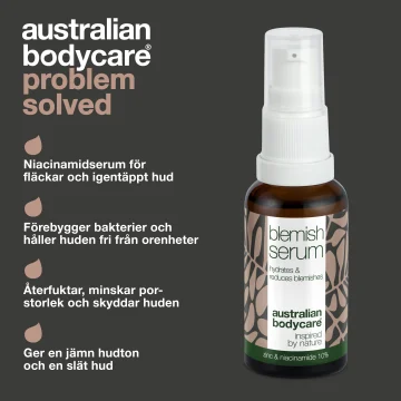 Australian Bodycare Blemish Serum är ett vårdande ansiktsserum med aktiva ingredienser. Serum med niacinamid och zink som verkar för att återställa huden och jämna ut huden. Ansiktsserum som tränger ned i hudens porer och hjälper till att minska förekomsten av finnar, pormaskar och utbrott. Passar för både män och kvinnor samt alla hudtyper, men särskilt oren hud. 30 ml.