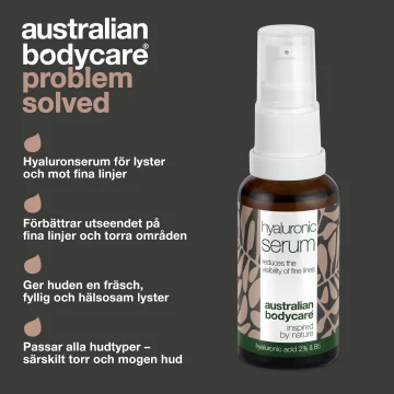Australian Bodycare Face Serum är ett ansiktsserum med aktiva ingredienser och naturlig tea tree oil. Serum som verkar fuktgivande med hyaluronsyra som hjälper till att reducerar fina linjer samtidigt som det skyddar huden med vitamin B5 och ger lyster. Ansiktsserum som tränger ned i hudens porer och vårdar torr hud. Passar för både män och kvinnor samt alla hudtyper, även känslig hud. 30 ml.
