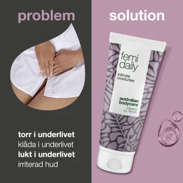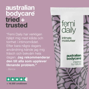 Australian Bodycare Femi Daily är en vårdande och vattenbaserad intimgel som hjälper till att motverka oönskad lukt, klåda och torrhet. Intimgelen har en skonsam formula och hjälper till att återställa balansen i intimområdet. Hormonfri. 100 ml.