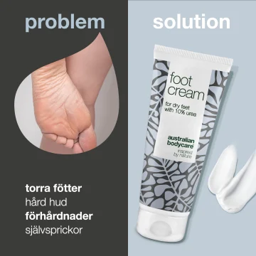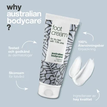Australian Bodycare Foot Cream är en vårdande och fuktighetsgivande fotkräm för torra fötter. Fotkrämen innehåller urea, sheasmör och naturlig tea tree oil. De noga utvalda ingredienserna hjälper till att motverka sprickbildning i huden, löser upp förhårdnader och minskar bildandet av ny hård hud. Ingrediensen tea tree oil hjälper även till att motverka dålig lukt. Vegansk. 100 ml.