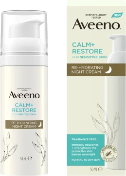 Aveeno CALM+RESTORE Re-Hydrating Night Cream är en lugnande och stärkande nattkräm som ger djup återfuktning. Den innehåller prebiotisk havre som är känd för att lugna och reparera huden genom att återställa hudens fuktbarriär. Nattkrämen återfuktar huden i upp till 48 timmar. 50 ml.