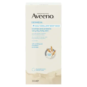 Aveeno Dermexa Daily Emollient Body Wash är en tvålfri, oparfymerad duschkräm som ger en mild men effektiv rengöring, även lämplig för den mycket torra och känsliga huden, även för dig som tenderar att få eksem. Berikad med prebiotika från trippel havrekomplex bestående av havremjöl, havreextrakt och havreolja samt ceramider som hjälper till att bevara hudens naturliga balans och mikrobiom samt återställer hudbarriären. Rengör huden varsamt utan att torka ut. Lämplig för vuxna och barn från 3 år. Passar torr och känslig hud. Parfymfri. 300 ml.