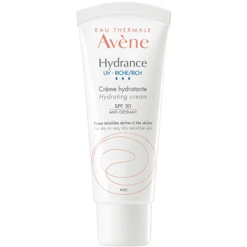 Avène Hydrance UV-Rich Hydrating Cream är en ansiktskräm för torr och känslig hy, berikad med SPF 30. Verkar lugnande och ger långvarig fukt som håller huden smidig och mjuk hela dagen. Skyddar mot UVA- och UVB-strålar. Absorberas snabbt utan att kladda. Passar normal, kombinerad och känslig hy. SPF 30. 40 ml.