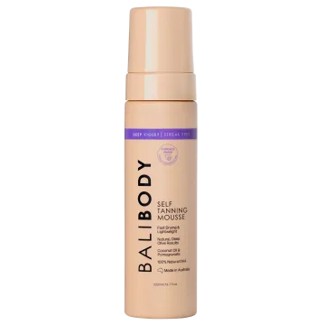 Bali Body Deep Violet Self Tanning Mousse skapar en djup, olivbrun solbränna. Brun utan sol-moussen har en violett bas som neutraliserar gula och orangea undertoner och ger en djup solkysst färg som passar medium hudtoner med varmare nyanser. Den lätta och snabbtorkande formulan är enkelt att applicera vilket ger ett jämnt resultat. Den är berikad med vårdande ingredienser som sheasmör, granatäpple och glycerin som gör huden mjuk och hjälper till att bevara färgen längre. Tack vare naturligt DHA från växtbaserade källor får du en solbränna som utvecklas på 6–8 timmar och håller sig fräsch i upp till sju dagar utan den typiska brun-utan-sol-doften. Produkten är dermatologiskt testad och passar alla hudtyper, även känslig hud. 200 ml.