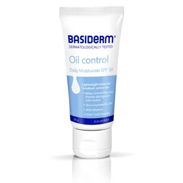 Basiderm Daily Moisturizer är en lättabsorberad dagcreme för känslig, fet och aknebenägen hud. 3-i-1 creme som återfuktar, skyddar och motverkar glansig hy samt lämnar huden matt. Innehåller en avancerad zink-, ceramid- och oleosometeknologi samt allantoin från vallört och exkrakt från lakritsrot som verkar mjukgörande och har en talgreglerande effekt. Innehåller solskyddsfaktor 30. Lämplig för känslig hud som genomgår aknebehandling med läkemedel. Kontrollerar talgproduktionen i hyn. Dermatologiskt testad. UVA / UVB-skydd, SPF30. Parfymfri. 50 ml.