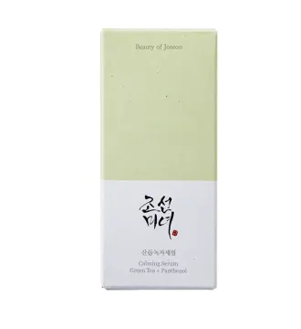 Beauty Of Joseon Calming Serum: Green Tea + Panthenol är ett serum som lindrar irriterad hud. Serumet är formulerat med 50 % grönt te och 30 % gråbo för att ge fukt och lindra huden, medan 5 % pantenol fungerar som en fuktbarriär för att skydda huden från att bli irriterad. 30 ml.