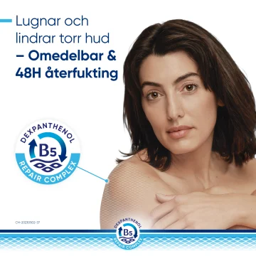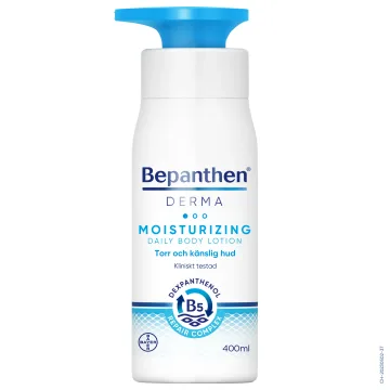 Bepanthen Derma Moisturizing Daily Body Lotion är en återfuktande hudlotion som hjälper till att lindra och lugna torr hud. Hudkrämen ger omedelbar och långvarig återfuktning som varar i upp till 48 timmar. Body Lotionen är enkel att applicera och går snabbt in i huden utan att kladda. Med en unik formulering som både ger omedelbar lindring och långvarigt skydd mot torr hud. Innehåller dexpanthenol som verkar djupgående för att stödja cellförnyelseprocessen, niacinamid som hjälper till att lindra torr hud, glycerin som återfuktar samt sheasmör och arganolja som hjälper till att stötta hudens egna lipidlager. Speciellt framtagen för torr och känslig hud. Passar spädbarn, barn och vuxna. Oparfymerad. Kliniskt testad och kliniskt bevisad. 400ml.