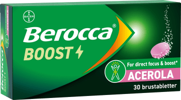 Berocca Boost är ett kosttillskott med vitaminer, mineraler och koffein. Innehåller vitaminerna B2, B3, B5, B12, C och magnesium som bidrar till att minska trötthet och utmattning. Innehåller även koffein bland annat från guarana, vilket hjälper dig att känna dig mer energisk. En brustablett innehåller 75 mg koffein. Rekommenderas ej för barn, gravida, ammande eller personer känsliga för koffein. Glutenfri och vegansk. Passar de över 18 år. 30 st.