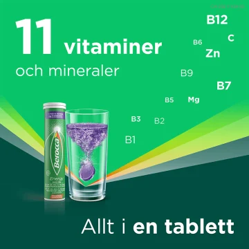 Surhetsreglerande medel (citronsyra, natriumvätekarbonat) Vitamin C (askorbinsyra) Magnesium (magnesiumsulfatdihydrat) Fyllnadsmedel (isomalt) Färgämne (kalcium (kalciumkarbonat)) Magnesium (magnesiumkarbonat) Fyllnadsmedel (sorbitol) Surhetsreglerande medel (natrium (natriumkarbonat)) Färgämne (allura rött) - Kan ha en negativ effekt på barns beteende och koncentration Niacin (nikotinamid) Fyllnadsmedel (mannitol) Arom (Hallon) Zink (zinkcitrattrihydrat) Arom (svartvinbär) Klorid (natriumklorid) Vitamin B5 (kalciumpantotenat) Vitamin B2 (riboflavinnatriumfosfat) Sötningsmedel (acesulfamkalium) Vitamin B1 (tiaminmonofosfatklorid) Sötningsmedel (sukralos) Vitamin B6 (pyridoxinhydroklorid) Vitamin B12 (cyanokobalamin) Skumdämpningsmedel (polysorbat 60) Vitamin B9 (folsyra) Färgämne (patentblått V) Vitamin B7 (biotin) Varje brustablett innehåller: INNEHÅLL 1 BRUSTABLETT % DRI * Vitamin B1 (Tiamin) 11,80 mg 1073 Vitamin B2 (Riboflavin) 15 mg 1071 Vitamin B3 (Niacin) 50 mg NE 313 Vitamin B5 (Pantotensyra) 23 mg 383 Vitamin B6 (Pyridoxin) 8,22 mg 587 Vitamin B7 (Biotin) 150 µg 300 Vitamin B9 (Folsyra) 400 µg 200 Vitamin B12 (Kobalamin) 10 µg 400 Vitamin C (Askorbinsyra) 500 mg 625 Magnesium 100 mg 27 Zink 10 mg 100 * DRI = Dagligt referensintag