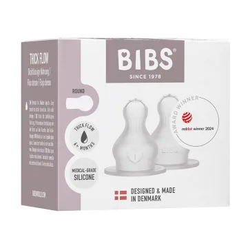 BIBS Baby Bottle Nipple Round Silicone Thick Flow är en flasknapp i mjuk silikon. Designad för att efterlikna bröstets naturliga form under amning för komfort och naturligt suggrepp. Dinappen har ett Y-format snitt som anpassar flödet efter barnets sugstyrka och är utformad för tjockare vätskor. Den är utrustad med antikolikfunktion som hjälper till att minska luftintaget för att förebygga gaser, reflux och kolik samt har en speciell textur som hjälper till med korrekt placering i munnen och förhindrar att flasknappen glider ut. BPA-fri. Rekommenderas från 6 månader. 2 pack.