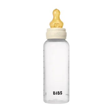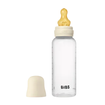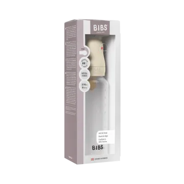 BIBS Baby Bottle Round Latex Medium Flow Ivory är en vit nappflaska med en rund sugdel i naturgummilatex. Nappen ger ett medelsnabbt flöde och är formad för att efterliknar mammans bröstvårta med syfte att främja en liknande tungplacering och sugteknik som den vid amning. Flaskan är designad för att vara lätt att greppa och kan enkelt göras ren i diskmaskin. Nappflaskan uppfyller Europastandard EN14350 och är fri från BPA. Kan användas av barn från 0+ månader. Flaskan rymmer 270 ml. 1-pack.