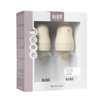 BIBS Baby Bottle Round Latex Slow Flow Ivory är en vit nappflaska med en rund sugdel i naturgummilatex. Nappen ger ett långsamt flöde och är formad för att efterliknar mammans bröstvårta med syfte att främja en liknande tungplacering och sugteknik som den vid amning. Flaskan är designad för att vara lätt att greppa och kan enkelt göras ren i diskmaskin. Nappflaskan uppfyller Europastandard EN14350 och är fri från BPA. Kan användas av barn från 0+ månader. Flaskan rymmer 150 ml. 2-pack.