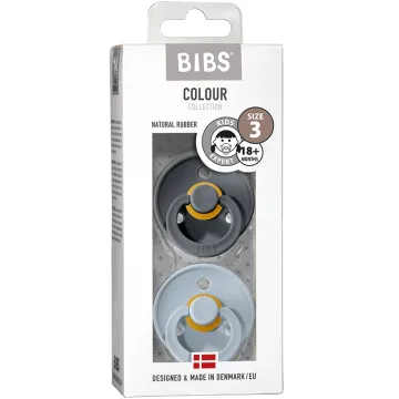 BIBS Colour Latex Size 3 Iron/Baby Blue är en trendig och stilren napp tillverkad i mjukt naturgummi. Sugdelen är försedd med en ventil som ser till att luft pressas ut och själva skölden böjer sig något utåt så att huden runt munnen inte blir irriterad. BIBS nappar har en rund form som många barn föredrar. Size 3 passar för 18+ månader. BPA-fri, PVC-fri och ftalatfri. Godkänd enligt EN 1400. 2-pack.