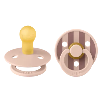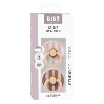 BIBS Pacifier Studio Colour Block Latex Size 1 Blush Mix är två randiga nappar med rund sugdel tillverkad i mjukt naturgummi. Skölden har tre ventilationshål som ser till att luft pressas ut samt böjer sig något utåt så att huden runt munnen inte blir irriterad. Godkänd enligt EN 1400+A2. Tillverkad i Danmark. 100% fri från BPA och ftalater. Size 1 passar barn i åldern 0-6 månader. 2-pack.