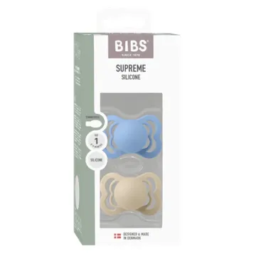 BIBS Pacifier Supreme Silicon Baby Vanilla/Sky Blue är en napp med en symmetrisk och platt sugdel i silikon. Skölden är utformad för att ge ett gott luftflöde runt munnen för att skona barnets känsliga hud. Tillverkad av livsmedelsgodkänt material och fri från BPA och ftalater. Uppfyller Europastandard EN 1400+A2. 2-pack.