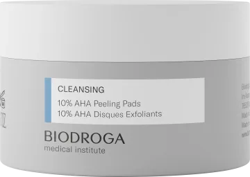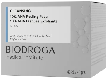 Biodroga Medical Institute 10% AHA Peeling Pads är exfolierande peeling pads som återfuktar, lugnar och tar bort döda hudceller vilket ger en slät och jämn hud med lyster. De innehåller en effektiv kombination av glykolsyra som löser upp döda hudceller vilket ger en slät hudyta och förbättrar hudens fuktbidningsförmåga vilket motverkar fina linjer och provitamin B5 som har en lugnande effekt på huden. Padsen har en strukturerad sida och en slät sida. Anpassade för alla hudtyper. 40 st.