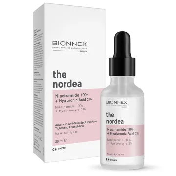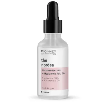 Bionnex The Nordea Niacinamide 10% + Hyaluronic Acid 2% Serum är ett utjämnande serum med återfuktande egenskaper. Serumet innehåller 10% niacinamid och 2% hyaluronsyra. Niacinamid hjälper till att minimera porernas synlighet, minska rodnad och mörka fläckar samt jämna ut hudtonen. Hyaluronsyra bidrar till en mer återfuktad hud. 30ml.