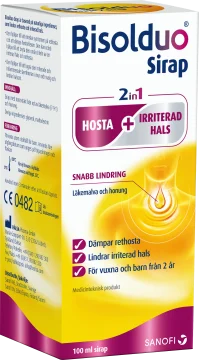 Dosering: Vuxna och unga: 5 ml upp till 6 gånger per dygn Barn 6–12 år: 5 ml upp till 3 gånger per dygn Barn 2–6 år: 2,5 ml upp till 3 gånger per dygn Observera! Använd inte Bisolduo® Sirap om du är allergisk (överkänslig) mot honung, rot av läkemalva eller något annat innehållsämne i Bisolduo® Sirap. Andra ämnen: glycerol, maltodextrin. Om din läkare har sagt att du inte tål vissa sockerarter, diskutera med läkare innan du tar denna produkt. Personer med det sällsynta ärftliga tillståndet fruktosintolerans eller glukos-galaktosmalabsorption bör inte ta denna medicintekniska produkt.