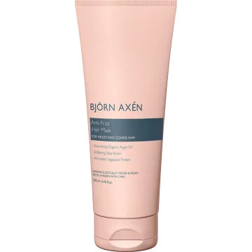 Björn Axén Anti-Frizz Hair Mask är en näringsgivande hårmask med lystergivande egenskaper. Hårmasken hjälper till att motverka frissigt hår och verkar utredande och lystergivande. Hårmasken innehåller ekologisk arganolja, sheasmör samt vegetabiliskt protein som motverkar att håret blir statiskt. Arganolja verkar näringsgivande och mjukgörande sheasmör hjälper till att mjukgöra och förhindra kluvna toppar. Passar frissigt och grovt hår. Vegansk. 200 ml.