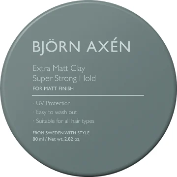 Björn Axén Matt Clay är ett extra matt och vårdande hårvax med UV-filter som ger en snygg finish. Mycket lättarbetat och fungerar lika bra på mörkt som ljust hår. Applicera i torrt hår. Fritt från parabener. 80 ml.