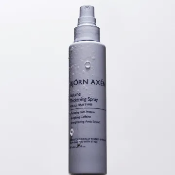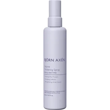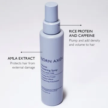 Björn Axén Volume Thickening Spray är en volymgivande spray som hjälper till att göra håret mjukt och fylligt. Tack vare risprotein, koffein och amla-extrakt får håret volym och fyllighet. Utöver stylingegenskaper fungerar produkten som ett skydd mot yttre påfrestningar. 150 ml.
