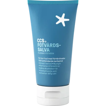 CCS Fotvårdssalva är en mjukgörande och återfuktande fotkräm speciellt framtagen för torra fötter och förhårdnader. Den innehåller 10% karbamid som binder fukt och verkar mjukgörande. Den hjälper även till att göra huden starkare och förbättra hudens skyddsbarriär. Salvan innehåller eukalyptusolja som ger en fräsch doft vid applicering samtidigt som den motverkar dålig lukt. 75 ml.