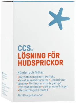 CCS Lösning för hudsprickor är en snabbverkande och transparent lösning som underlättar läkning av hudsprickor på både händer och fötter. Vid applicering bildas en skyddande, elastisk och vattenresistent film som torkar omedelbart. Lösningen lindrar smärta och skyddar huden från yttre påfrestningar. Minskar även risken för infektion och kan användas av diabetiker på icke infekterade hudsprickor. Passar alla hudtyper. 7 ml.