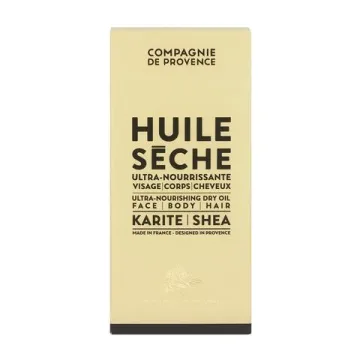 Compagnie de Provence Ultra Nourishing Dry Oil Shea Butter är en torrolja förr ansikte, kropp och hår. Oljan innehåller shea absolut, mjukgörande ren druvkärneolja, ekologisk jungfrulig solrosolja och sötmandelolja med återfuktande egenskaper. Med torrolja menas att oljan absorberas av huden vid applicering utan att lämna en fet hinna. Torroljan kan också användas i hårets toppar och längder för att ge glans och mjukhet. Oljan är berikad med E-vitamin och återfuktar, vårdar och ger lyster. Med en doft av vita blommor som övergår i en mjuk mustig bas.100 ml.