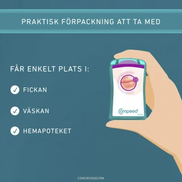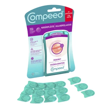 Compeed Munsårsplåster är ett diskret plåster som skyddar och döljer munsår, samtidigt som läkningsprocessen påskyndas. Plåstret fungerar även som en barriär som minskar risken för att få in smuts i såret, och minskar risken för vidare smittspridning. Munsårsplåstret består av en ultratunn polyuretanfilm med en aktiv hydrokolloidgelteknik som ger munsåret en optimal miljö som kan bidra till att förhindra att det blir större och även främja snabbare läkning. Compeed Munsårsplåster kommer i en liten, praktisk och diskret ask som är lätt att ha med sig i handväskan eller fickan. Asken är försedd med en liten spegel för att du enkelt ska kunna applicera plåstret var du än är. Förpackningen innehåller 15 st munsårsplåster, beräknat att räcka för en full behandling vid herpesvirus. När du bär munsårsplåstret kan du äta och dricka om vanligt. Plåstret följer med munnens rörelser och sitter på plats i upp till 12 timmar. 15 st.