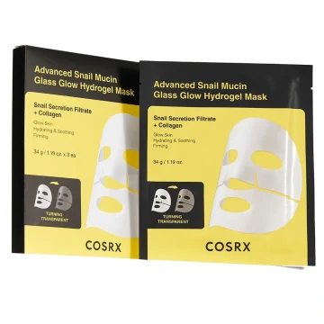 COSRX Advanced Snail Mucin Glass Glow Hydrogel Mask är en ansiktsmask formulerad med snigelsekret (Mucin). Masken blir genomskinlig under tiden den verkar och återfuktar på djupet, lugnar och mjukgör hudstrukturen för en hud med lyster. 3 st.