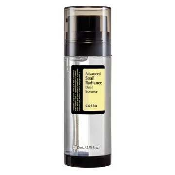 COSRX Advanced Snail Radiance Dual Essence är ett ansiktsvatten berikat med 74,3% snigelsekret och 5% niacinamid som jämnar ut huden, verkar återfuktande och hjälper till att ljusa upp pigmentering och läka akneärr. 80 ml.