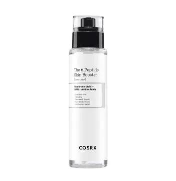 COSRX The 6 Peptide Skin Booster Serum är ett lugnande serum med 6 olika peptider som tillsammans förbättrar kollagenproduktionen, vilket bidrar till mindre fina linjer. Serumet jämnar ut hudtonen, hjälper till att minimera porer, ger lyster och lugnar huden. Detta serum kan användas för att förstärka effekten av hyaluronsyra, C-vitamin eller retinolserum. 150 ml.