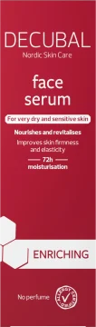 DECUBAL Enriching Face Serum är ett närande serum för ansiktet med lätt konsistens. Serumet hjälper till att förbättra hudens fasthet och elasticitet och innehåller ceramider, kollagen, E-vitamin, C-vitamin och rödalger. Den hudanpassade teknologin hjälper till att skydda och återfukta huden. Icke-komedogen. Oparfymerad. Passar alla hudtyper, även torr och känslig hud. 30 ml.