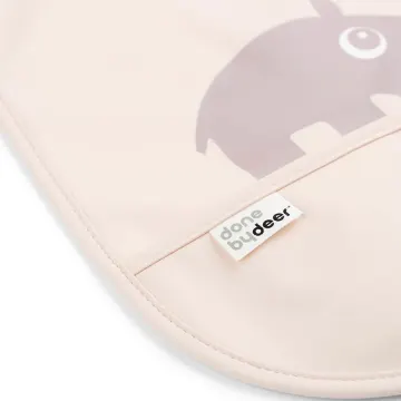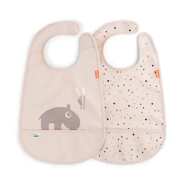 Done by Deer Bib with velcro Ozzo Powder är ett set med två mjuka och vattentäta haklappar. Haklappen fästs med kardborre som gör dessa enkla att ta av och sätta på. De är lätta att torka rena och har en ficka som fångar upp maten som spills. 2-pack