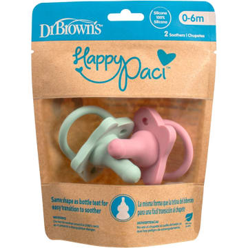 Dr. Brown's HappyPaci Silicone Soother 0-6m Rosa/Grön är en napp av silikon med samma form som dinappen i Dr. Brown's nappflaska (smal hals) som hjälper till att underlätta övergång mellan tröstnapp och flaskmatning. Sugnappen är gjord i ett stycke med öppen nappsköld. Kan rengöras i diskmaskin, i sterilisator eller kokande vatten. Passar 0-6 månader. 2-pack.