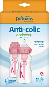 Dr. Brown's Options+ Nappflaska Bred Hals Rosa innehåller fem nappflaskor i två olika storlekar. Nappflaskorna är försedd med en unik ventil som avlägsnar luftbubblor och vakuum för att motverka kolik hos småbarn. Ventilen tillåter barnet att dricka i sin egen takt. När barnet blir större kan ventilen tas bort och flaskan kan användas som en vanlig nappflaska. Nappen är gjord av silikon som efterliknar moderns bröstvårta på ett naturligt sätt. 2-pack. 270 ml.