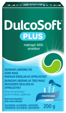 DulcoSoft Plus ger skonsam lindring vid hård mage och minskar känslan av uppblåsthet. Verkar genom att återfukta och mjuka upp hård avföring samt eliminera gaser. Blandas enkelt med valfri dryck och verkar inom 24-72 timmar. Medicinteknisk produkt som innehåller makrogol 4000 och simetikon. Läs bruksanvisningen noga före användning. Fri från socker, laktos och gluten. För vuxna och barn från 6 månader. Läkare bör rådfrågas innan användning hos barn.
