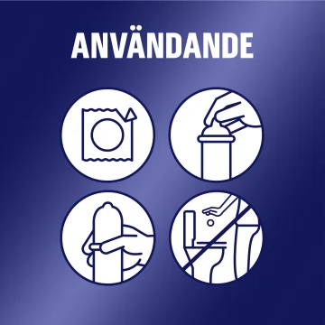 Innan du använder kondomen ska du kontrollera utgångsdatumet på omslaget. Om det enskilda kondomomslaget är skadat ska du kasta kondomen och ta en ny från ett oskadat omslag. Trä på en kondom innan penis berör den andra personen. Det bidrar till att förhindra graviditet och minskar risken för att smittas av sexuellt överförbara infektioner under vaginalt sex samt anal- eller oralsex. Öppna omslaget vid den perforerade kanten. Ha rullen vänd utåt. Fatta tag om behållaren och sätt kondomen på toppen av den erigerade penisen. Rulla ner kondomen till penisroten. Släng den då och ta en ny kondom. Kontrollera om det känns som att kondomen ska glida av eller om den sitter åt för hårt, eftersom detta kan leda till att den går sönder. Ta av kondomen så snart som möjligt efter utlösningen. Håll kondomen i ett fast grepp vid penisroten när du drar ut penisen. Kasta folien och den använda kondomen i en papperskorg. Kondomerna får inte spolas ner i toaletten.
