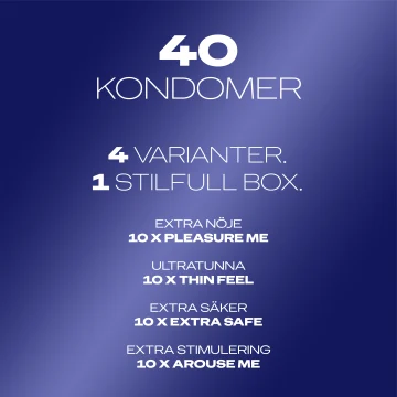 Durex Surprise Me Mix innehåller fyra olika sorters kondomer med varierande bredd och form. Gör det enkelt att hitta en kondom som du känner är säkrast och skönast, eller helt enkelt passar stunden bäst. 40 st. Surprise Me-mixen innehåller: 10 st. Tickle Me: Rosa kondomer som är extra stimulerande med ribbad yta. 10 st. Pleasure Me: Transparenta kondomer som är extra stimulerande tack vare ribbad och knottrig utsida. 10 st. Extra Safe: Transparenta kondomer som är extra glidmedelsbehandlade och något tjockare. 10 st. Thin Feel: Transparenta kondomer som är extra tunna och ger en ökad känslighet