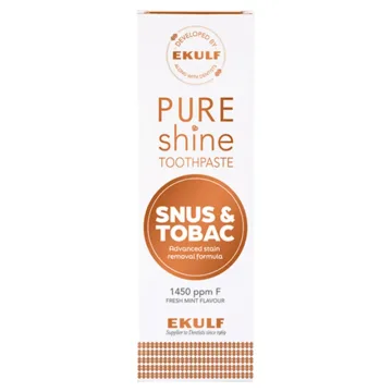 EKULF PURE Shine Snus & Tobac är en tandkräm som avlägsnar fläckar och missfärgningar, orsakade av snus och tobak. Tandkrämen är berikad med en hög fluoridhalt som bidrar till att remineralisera tänderna, samtidigt som den stärker rotytan och emaljen. Den skyddar även mot syra. Sammansättningen av ingredienser avlägsnar plack och missfärgningar från tandytan som kan orsakas av snus, tobak, kaffe, te och vin. Tandkrämen har en uppfriskande smak av mint. 75 ml.