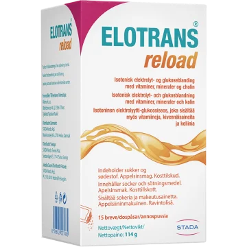 Elotrans Reload är en vätskeersättning med apelsinsmak. Elotrans Reload är en isotonisk elektrolyt- och glukosblandning som innehåller magnesium samt vitamin B2 och B5, Magnesium, vitamin B2 och vitamin B5 bidrar till att minska trötthet och utmattning samt till normal energiomsättning. Kosttillskottet innehåller även kolin som bidrar till att bibehålla normal leverfunktion. Innehåller socker och sötningsmedel. En förpackning innehåller 15 dospåsar med pulver för beredning av oral lösning. Vegansk, glutenfri och laktosfri. 15 st.