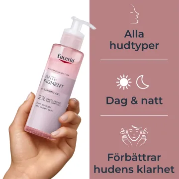 Eucerin Anti-Pigment Cleansing Gel är en exfolierande rengöringsgel som rengör huden på djupet. Berikad med AHA- syra som skonsamt tar bort döda hudceller och ger en jämn hudton. Rengöringsgelen är även berikad med Glyceryl Glycose som bibehåller fukten i huden. Utan alkohol, tvål eller parfym. 200 ml.