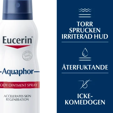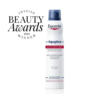 Eucerin Aquaphor Body Ointment Spray är en mjukgörande spray som lugnar torr och irriterad hud och bildar en skyddande barriär som bidrar till hudåterbildning. Sprayen gör det lättare att täcka större kroppsdelar, som ben och rygg, och är enkel att applicera. Oparfymerad. 250 ml.